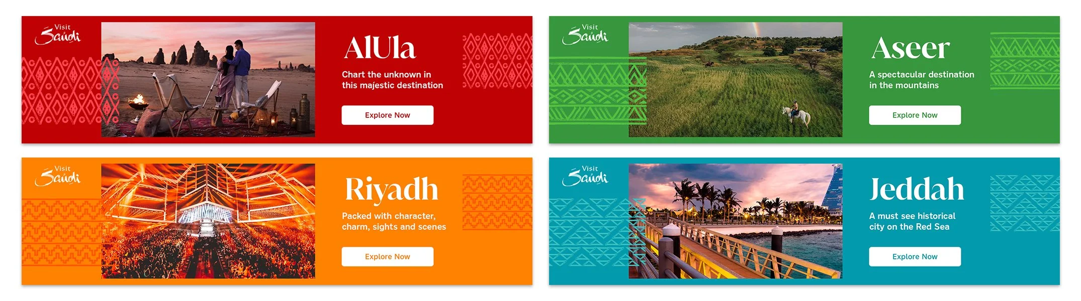 This project was created to promote tourism in Saudi Arabia by highlighting the country’s diverse attractions through motion graphics, web banners, and large‑format billboards. Designed to spark curiosity and inspire travel, the campaign showcased the region’s natural beauty and cultural depth. Using Visit Saudi’s established branding and photography as a foundation, I incorporated animation and custom design treatments to bring the visuals to life, creating a more immersive and engaging experience. These ad concepts were developed for a client pitch.